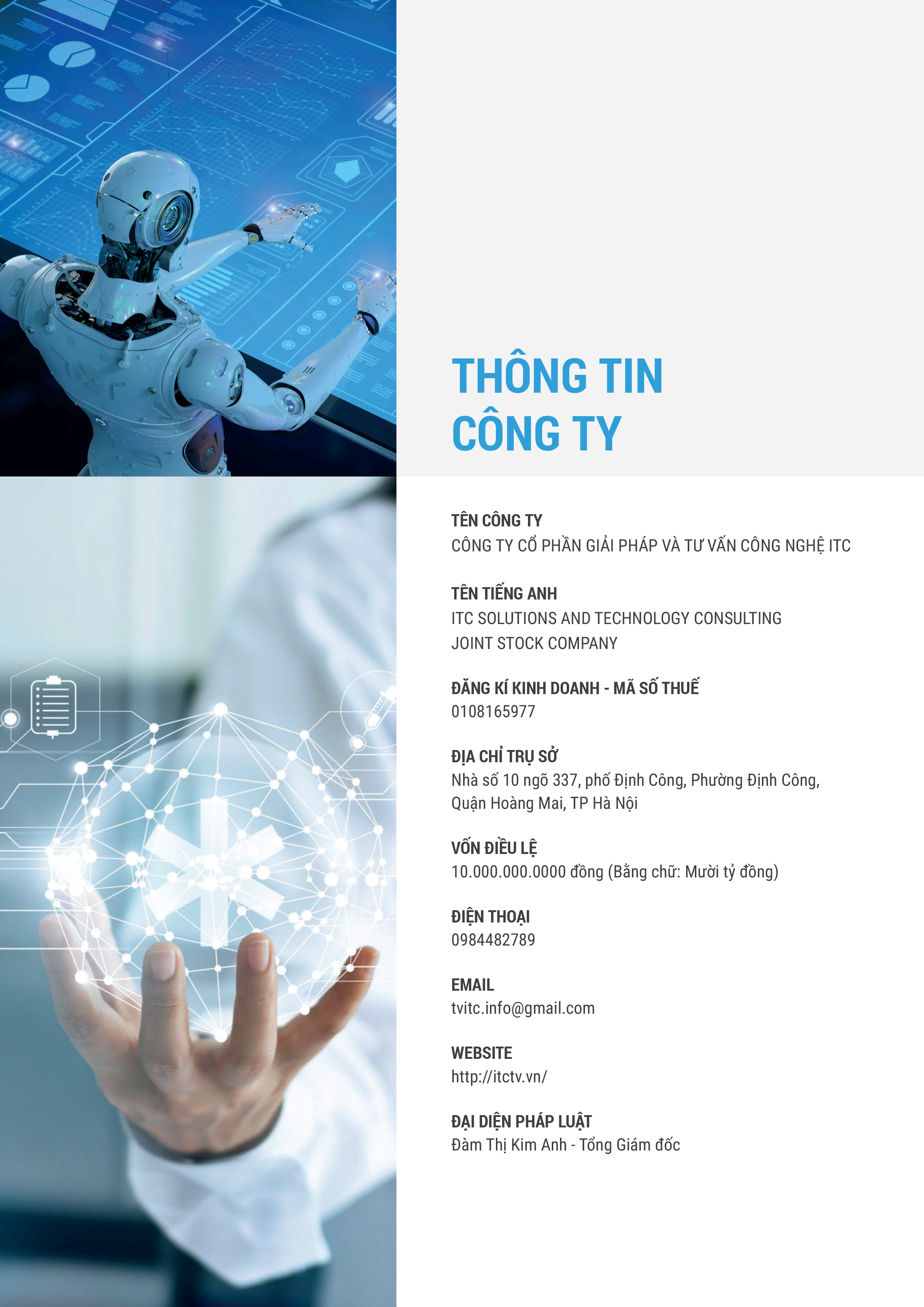 Công ty Cổ phần Giải pháp và tư vấn công nghệ ITC là đơn vị cung cấp dịch vụ trong lĩnh vực dịch vụ tư vấn, dịch vụ kiểm thử và dịch vụ công nghệ thông tin.